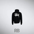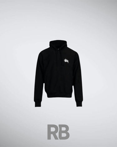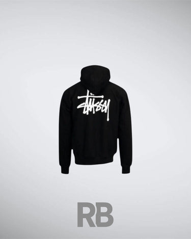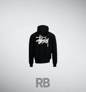 The stussy Basic Black Hoodie is a streetwear essential featuring a soft cotton-blend fleece, relaxed fit, drawstring hood, and kangaroo pocket. It has a minimal front and a bold stussy Stock Logo on the back, making it a versatile and stylish staple.